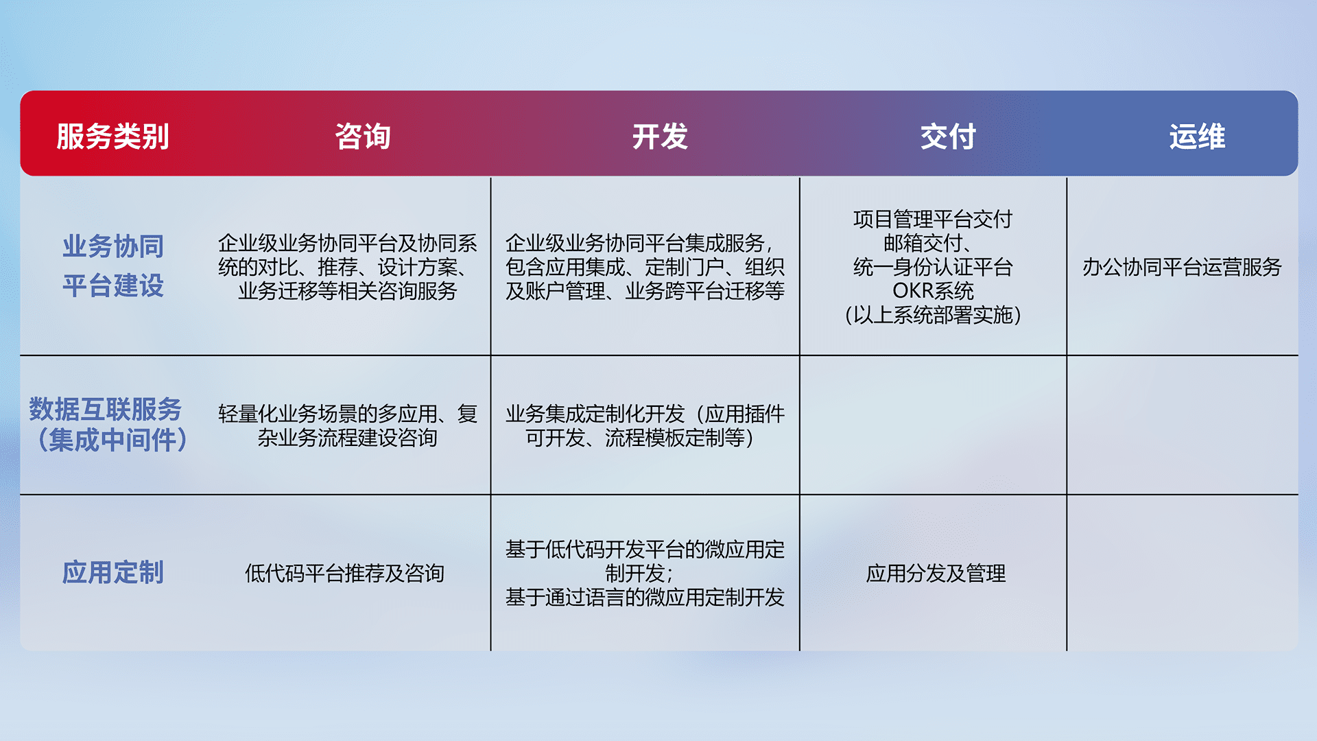 针对钉钉、、、、企微、、IDaas等平台级产品提供产品的规划、、方案、、、交付、、定制化开发等服务,,,实现如统一协同办公、、智能客户服务、、、混合会议管理、、、智能数据查询、、、、等业务场景,,实现数字化转型。。。